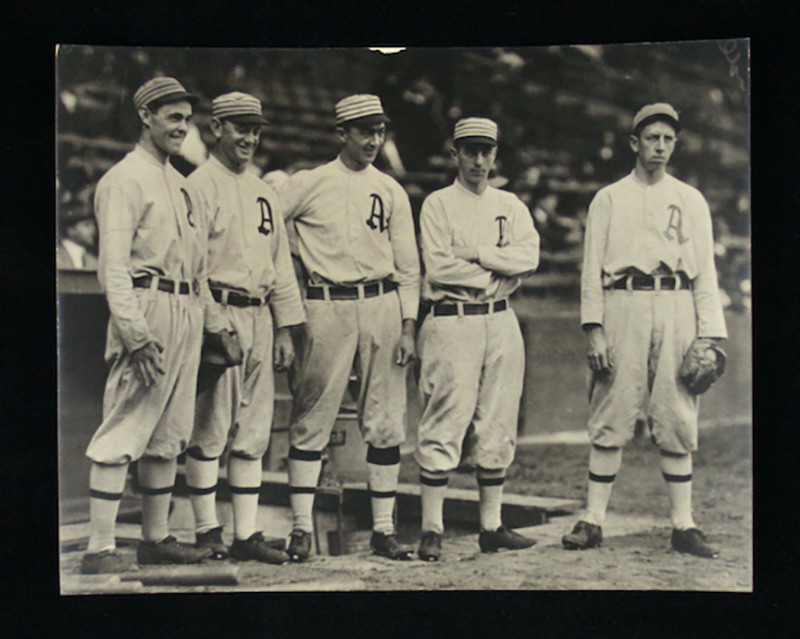 Description:Philadelphia Athletics "$100,000 infield" George Burke photograph, c.1920-30s (EX). Approx. 7.5"x9.5" photo picturing (5) Philadelphia A's including the famous $100,000 infield of Eddie Collins, Home Run Baker, Snuffy McInnis, and Jack Barry, with another player in the photo (appears to be Danny Murphy). Back is stamped "GEO. BURKE, PHOTO" "847 BELMONT AVE" "CHICAGO". Small area of surface loss at the very top edge, with areas of discoloration on the back: EX