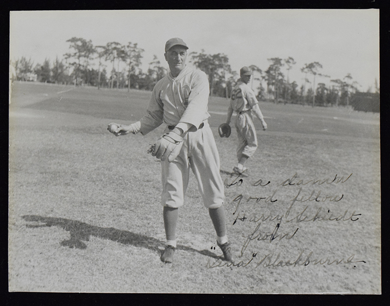 Description:Lena Blackburne (d.1968) signed vintage photograph, c.1930s-40s (EX/MT). 7.25"x9.5" photo picturing Blackburne while coach for the Philadelphia A's. Blackburne signed the photo in black fountain pen (personalized). Signature rates 7 out of 10. Affixed to cardboard backing: EX/MT