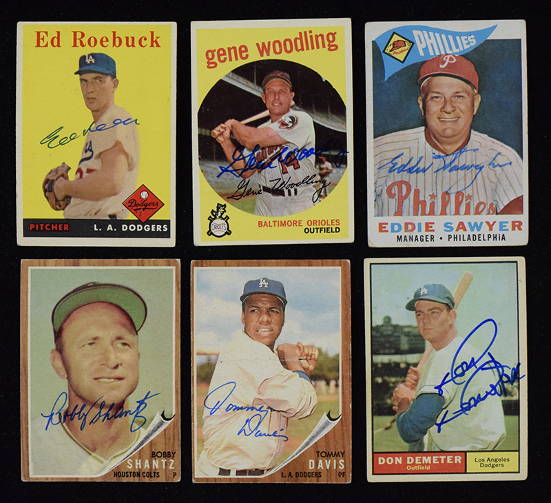 Description:Lot of (44) signed baseball cards from 1958-1962 (GD-EX/MT). Includes 1958 Topps: Ed Roebuck, and (6) Bob Malkmus; 1959 Topps: (2) Jack Sanford, Gene Woodling, Tony Taylor, and Bob Malkmus; 1960 Topps: Eddie Sawyer, Bill Bruton, Cal McLish, Ron Hansen, Jack Sanford, and (2) Don Cardwell; 1961 Topps: (2) Frank Thomas, (2) Ed Bouchee, Elmer Valo, (3) Bob Del Greco, Don Demeter, and Johnny Romano; 1962 Topps: (2) Bob Oldis, (3) Roy Sievers, Jack Baldschun, Tommy Davis, Dick Hall, (2) Bobby Shantz, and (5) Barney Schultz. Signatures rate 6/7 to 10 (avg 8) out of 10. Most cards appear to average VG overall. Range: GD-EX/MT