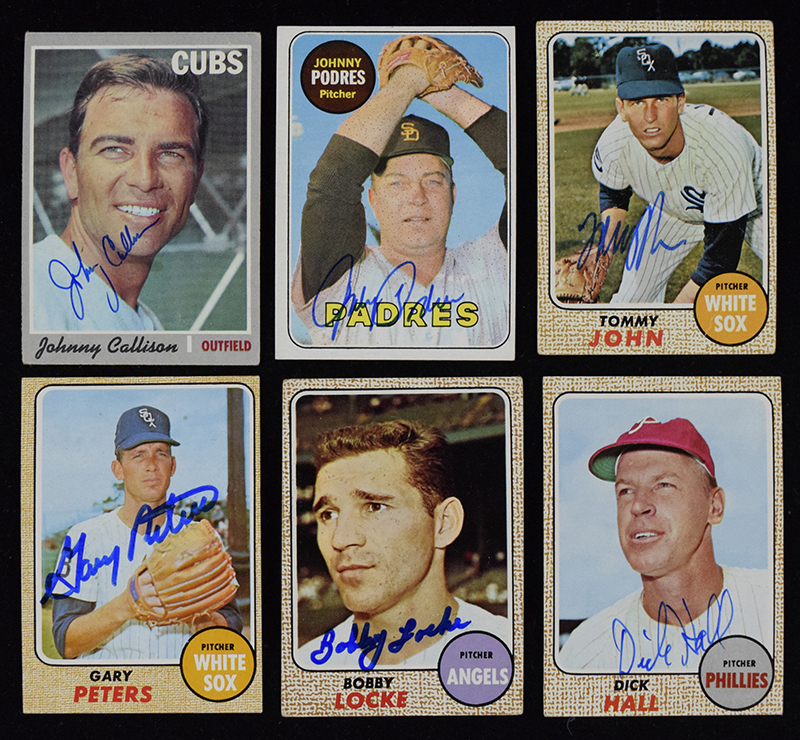 Description:Lot of (77) signed baseball cards from 1968-1971 (PR/FR-NM). Includes 1968 Topps: (2) Tommy John, (4) Bobby Locke, Boog Powell, (2) Jay Johnstone, (8) Dick Hall, (3) Phil Linz, (4) Gary Peters (one has back damage), George Culver, and (2) Alex Johnson; 1969 Topps: Tommy Davis, Johnny Podres, (2) Alex Johnson, Ron Reed, Jim Lonborg, Don Money, and Clay Dalrymple; 1970 Topps: (2) Gary Peters, (7) Bobby Wine, (2) Alex Johnson, Johnny Callison, (2) Don Cardwell, (2) Dick Hall, Jack Baldschun, Ron Hansen, and Pat Corrales; 1971 Topps: (2) Stan Bahnsen, Dick Hall, Tony Gonzalez, (2) Pat Corrales, Jim Lonborg, Jay Johnstone, (4) Gary Peters, Claude Osteen, (2) Bobby Wine, (2) Johnny Callison, (2) Tommy Davis, and (4) Boog Powell. Signatures rate 6/7 to 10 (avg 8) out of 10. Most cards appear to average VG/EX overall. Range: PR/FR-NM
