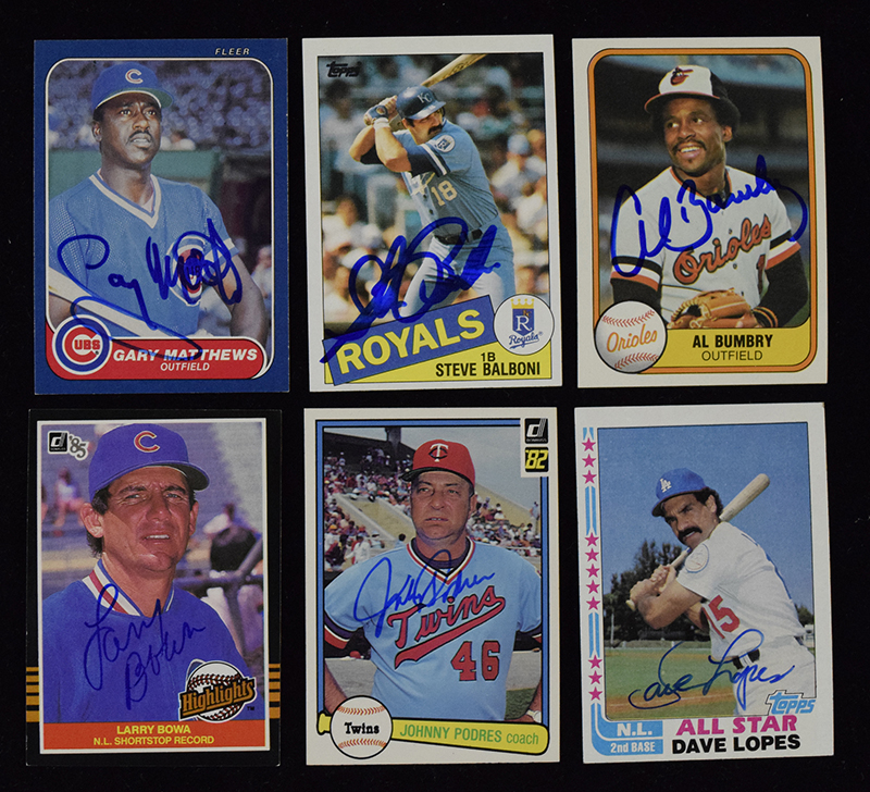 Description:Lot of (508) signed baseball cards from 1981-2001 (VG-NM/MT). Incl. Dallas Green, Jim Fregosi, Danny Ozark, Johnny Podres, Roy Sievers, Gene Woodling, Paul Blair, Gene Conley, Willy Miranda, Willard Marshall, Bill Bruton, Sam Calderone, Ron Jones, Larry Bowa, Gary Matthews, Steve Rogers, Gene Garber, Davey Lopes, Ron Cey, Steve Balboni, Bobby Shantz, Tommy John, Jim Lonborg, Tommy Davis, Boog Powell, Bobby Wine, Mike Easler, Steve Bedrosian, Shane Rawley, Bake McBride, Rick Wise, John Montefusco, Don Money, Claude Osteen, Gary Peters, Mark Davis, Grant Jackson, Shawon Dunston, Lonnie Smith, Bill Virdon, Al Bumbry, Bob Walk, Al Holland, Glenn Wilson, Pat Zachry, Bob Oldis, Rich Hebner, Mitch Williams, Pat Corrales, Ken Howell, Greg Gross, Marty Bystrom, Randy Lerch, Rawly Eastwick, Jason Grimsley, George Culver, John Russell, Larry Andersen, Bob Dernier, Ramon Aviles, Keith Moreland, Phil Bradley, Glenn Hubbard, Jay Johnstone, Gary Redus, Ron Reed, George Vukovich, Jose DeJesus, Randy Kramer, Andy McGaffigan, Darnell Coles, Terry Leach, Donnie Hill, Rocky Childress, and others. Duplication of most mentioned. Sigs rate 3 to 10 (avg 8) out of 10. Cards avg NM overall. Range: VG-NM/MT