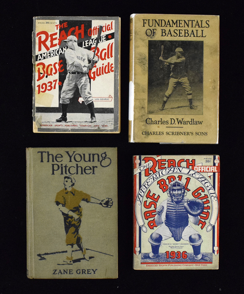 Description:Lot of (17) c.1910s-60s baseball related books and publications (GD-EX/MT) Includes Reach American League Baseball Guides as issued in 1936 (Mickey Cochrane on cover) and 1937 (Lou Gehrig on cover which is taped in place); Once A Clown Always A Clown signed by DeWolf Hopper; Fundamentals Of Baseball by Charles Wardlaw (with dust jacket that some missing chips/pieces); Tommy Tiptop And His Baseball Nine by Raymond Stone; The Sun Field by Heywood Broun; The Real Billy Sunday by Elijah Brown; Bobby Blake On The School Eleven by Frank Warner; Zane Gray books The Redheaded Outfield and The Young Pitcher; 1945 and 1953 baseball annuals/guides; On Your Toes softcover book which is signed inside by Babe Herman; 1949 Mid Atlantic League guide which is hardbound; Secrets Of Baseball told by Big League Players by Mitchell Charnley; 1954 Dallas Eagles yearbooks; 1949 NAPBL rule book. Varying degrees/types of wear throughout: GD-EX/MT