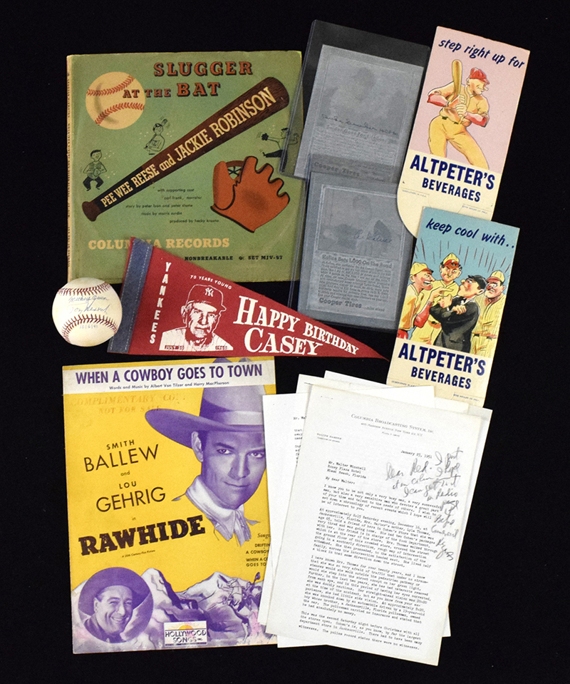 Description:c.1930s-70s Baseball memorabilia and souvenirs incl. signed pieces (GD-EX/MT) Includes "When A Cowboy Goes To Town" sheet music with Lou Gehrig pictured on front (related to Rawhide movie); 1942 Look Magazine with Gary Cooper on the cover in his role as Lou Gehrig; Mickey Owen and Tom Henrich dual-signed OAL baseball (light toning) along with Owen and Henrich signed "Mickey Owen Baseball School" booklet; additional Owen pieces incl. advertising coaster for Ballantine, signed mini bat, signed photo/copy of a Mexican League contract, and unsigned Owen Baseball School hat; (2) Altpeter's Beverages baseball themed advertising display pieces; (5) Cooper Tires advertising related pieces which are all done in what appears to be plastic and have a likeness of the player and related text. Three are signed incl. Duke Snider, Wally Moon, and Al Kaline with Jim Gilliam and Gil Hodges unsigned; 1948, 50, and 52 Sporting News Radio Edition Baseball Guides; additional guide from 1948; interesting group of (3) letters which were written by Red Barber (each signed "Red") to Walter Winchell regarding an automobile accident. Also included is a drawing detailing the events which is presumed to have been done by Barber as well; Red Barber signed "Walk In The Spirit" softcover book (personalized); 1951 "Baseball Year & Note Book" published by Heilbroner Bureau; 1960 "Happy Birthday Casey" mini-pennant; and (10) baseball related records and/or record albums, most of which have star players pictured or listed. Varying degrees/types of wear throughout: GD-NM