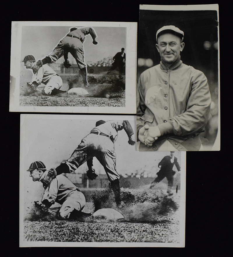 Description:Lot of (3) Ty Cobb photos incl. second generation Conlon "sliding" image (GD-EX) Includes 5"x7" black and white print of Conlon's famed image of Cobb sliding which has photographers mask applied in a few places and some paper loss within the side borders. Mounted to heavy stock backing which has a number of markings/notations including Culver stamps. Purchased from HYee Auctions at which time it was identified by Henry Yee as a second generation c.1940s print; additional 8"x10" print of the same sliding photo which also has Culver and other markings on back. This photo likely dates to a later period (c.1960s-70s); 4.5"x8" sepia toned photo of Cobb which has 1927 date stamp (among other markings) on back. This was trimmed from a larger image and has some light wear and photographers mask has been removed. Varying degrees of wear throughout: GD-EX