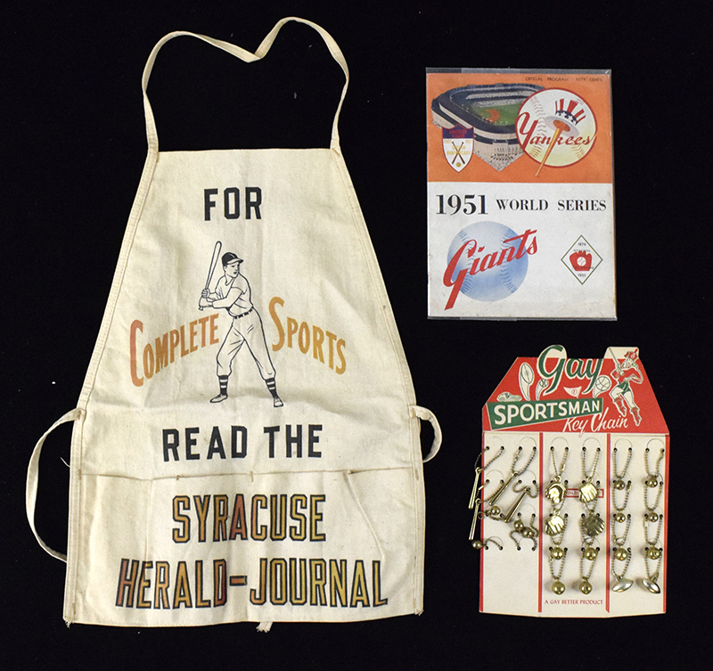 Description:Interesting lot of c.1940-60s baseball memorabilia and souvenirs (GD-EX/MT) 1951 New York Giants yearbook; 1951 World Series program; 1954 Brooklyn Dodgers press release related to Roy Campanella; 1947 World Series and 1948 All-Star Game film reels in original boxes; additional role of film in holder which has 1956 year written on and "Gillette Gil Hodges" typed on; oversized "Grandstand Manager" heavy stock scorer; handmade wooden baseball player display piece; 1959 World Series Game (2) full proof ticket along with a Go-Go Sox souvenir pin and similar period Christmas card; Syracuse Herald Journal vendor's apron with baseball player graphic; Heavy stock "Gay Sportsman Key Chain" die-cut store display has all spaces filled with (24) original baseball and football themed key chains remaining in place; and others. Varying degrees of wear throughout: GD-EX/MT