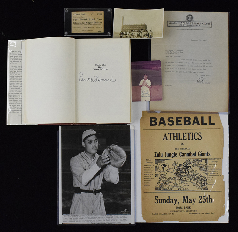 Description:Negro League and related lot incl. broadside, autographs, and others (FR/GD-EX/MT) Includes "Athletics vs. The Original Zulu Jungle Cannibal Giants" advertising broadside (chipping/tears to corners/edges); "Willie Mays All-Stars" game admission ticket; c.1950s "Fort Worth Black Cats vs. Cleveland Negro Indians" game ticket; press photo of Joe Louis in uniform with caption printed at lower front related to his "Bombers" softball team. Date of 1937 is stamped on back; small vintage snapshot photo of an African American baseball team in uniform; c.1940s-50s "Colored State Baseball Tournament" scorecard from Waco, Texas; hardcover copy of "Only The Ball Was White" which has been signed on the title page by Buck Leonard and an interior page signed by (17) inl. Mahlon Duckett, Buck O'Neil, Wilmer Fields, Gene Benson, and others; Buck Leonard signed 1970s snapshot photo; Buck O'Neil signed "Baseball Legend" book; 1951 typed letter on Philadelphia Athletics team stationary related to the team potentially signing Judy Johnson (signed by Arthur Ehlers; Oscar Charleston modern printed 8"x10" photo; and other mostly modern images and publications: FR/GD-EX/MT