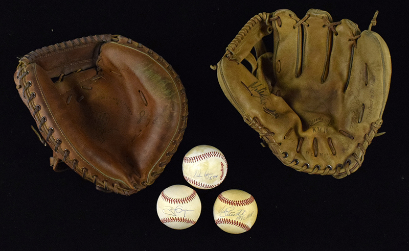 Description:Modern Hall of Famer and star autograph lot (6 pieces) (EX-NM) Includes 1998 World Series logo baseball signed by Tony Gwynn (mild toning); 1980 World Series logo baseball signed "Mike Schmidt 1980 MVP" (toned); 1979 All-Star Game logo ball signed by Steve Carlton and Nolan Ryan. The Ryan signature has faded and inscription below his autograph may have been added later by someone else (toned); Roger Clemens signed Rawlings G.Budig OAL ball; Rawlings Mike Schmidt signature model glove has been signed by Schmidt in marker rating 7-7/8 out of 10 (wear/use to glove); Rawlings Johnny Bench signature model glove has been signed by Bench in ink rating 6-6/7 out of 10 (wear/use to glove). Signatures rate 7 to 9 out of 10 (unless noted): EX-NM