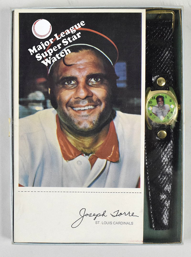 Description:1968 Major League Super Star Joe Torre watch in original box (EX-NM) Includes unused watch which has some light wear to front of the glass which matches an area on the clear lid of the original box where there must have been pressure/rubbing during storage. Box has a touch of light wear. Also includes the original Torre premium: EX-NM