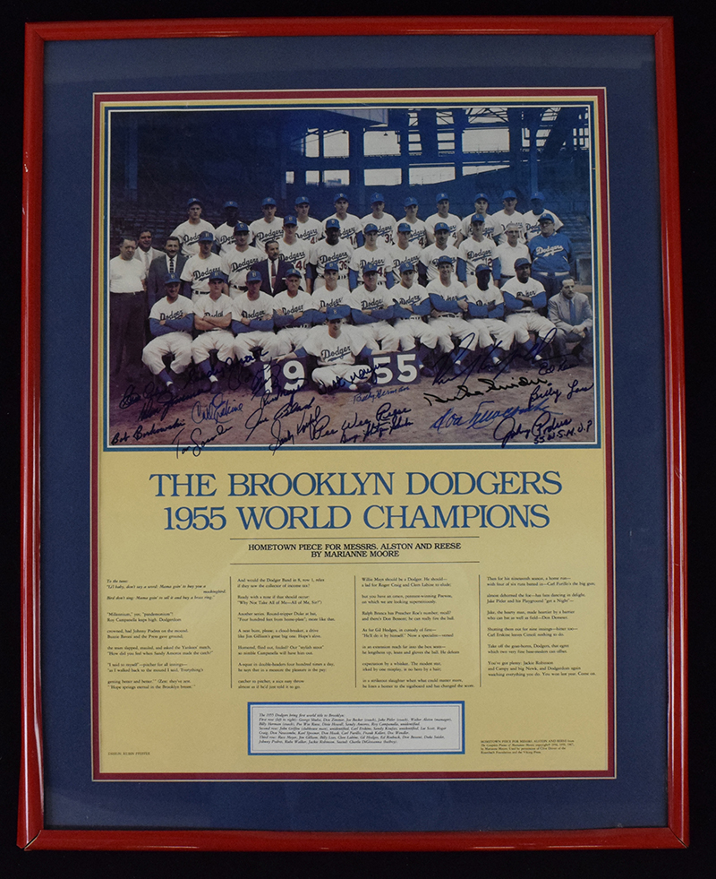 Description:1955 Brooklyn Dodgers poster autographed by team members (see description) Large format poster (framed to 23"x29.5", wear to frame) has been signed by a number of team members incl. Duke Snider, Billy Herman, Johnny Podres, Carl Erskine, Don Zimmer, and others. There is a signature of Roy Campanella which JSA has deemed not authentic and it is possible that a few others were similarly added in for display purposes. Signatures rate 8 to 9 out of 10: see description