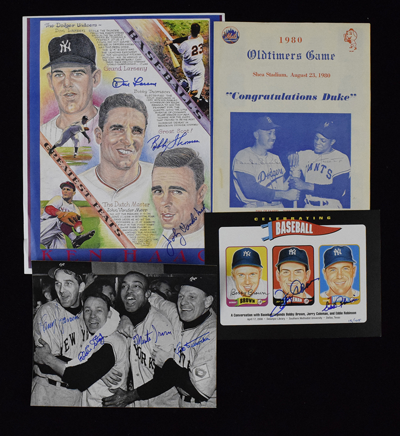 Description:Lot of (7) multi-signed baseball pieces (19 signatures) (EX-NM) Nice selection of multi-signed pieces with all being 8"x10" photos unless noted. Includes Duke Snider and Willie Mays signed 1980 Old-Timers Day program; photo signed by Leo Durocher, Monte Irvin, Ed Stanky, and Larry Jansen; photo signed by Roy White, Bucky Dent, and Chris Chambliss; photo signed by Bobby Thomson and Ralph Branca; photo signed by Enos Slaughter, Marty Marion, and Roy Partee; print (slightly smaller) signed by Jerry Coleman and Eddie Robinson); 11"x14" print signed by Don Larsen, Bobby Thomson, and Johnny VanderMeer. Signatures rate 8 to 9 out of 10. Touch of very light scattered wear: EX-NM