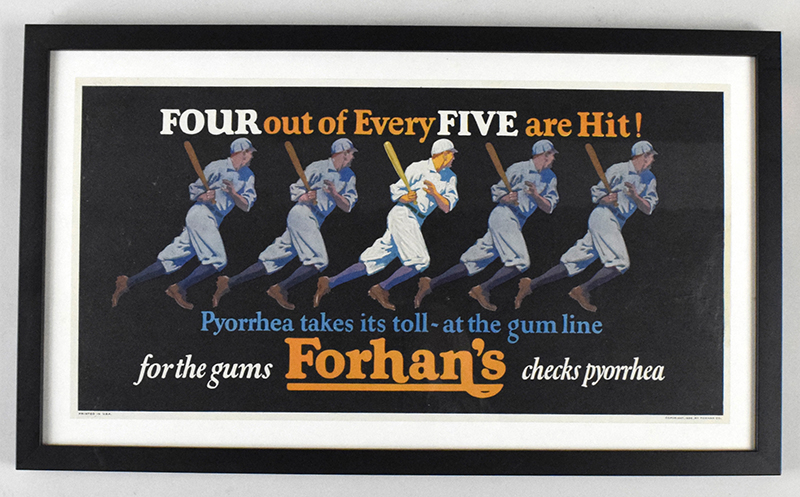 Description:c.1924 "Four out of Every Five are Hit...Forhan's" baseball themed advertising piece (Displays EX) Color and well done period advertising piece has been framed to 14"x23.5" with EX display qualities. There has been some restoration and inpainting to areas throughout: Displays EX