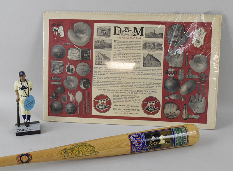 Description:Interesting lot of c.1910s-90s baseball memorabilia and souvenirs (GD-NM) Includes c.1910s magazine/publication centerfold page which advertises Draper & Maynard products (shrink wrapped to 14"x22.5" cardboard); 1934 Tour of Japan American and Japanese baseball team photo with 1976 copyright date (framed to 16"x19"); panoramic image of a June 1903 Princeton vs. Yale baseball game which is printed on period glossy paper stock that is folded in thirds (8"x28" when unfolded); "Sportsmen's Headquarters+The Winchester Store" paper stock display which has been matted to 7.5"x19". The piece shows toning/age but we are not able to state in what time period it would have been produced; decorative bat like display piece which is carved and highlighted by bright color; wooden bat with "Official Ty Cobb Ball Bat" centerbrand stamp and a "Georgia Peach" decal on the barrel; Roy Campanella commemorative bat by Cooperstown Bat Co.; Dick Whitman signed Phillies hat; Monte Irvin signed statue; figural batter statue (bat broken/fixed and there are some other condition issues); (2) baseball themed porcelain mugs; Hank Aaron bobblehead; and an assortment of other baseball related souvenirs and memorabilia. Varying degrees/types of wear throughout: GD-NM