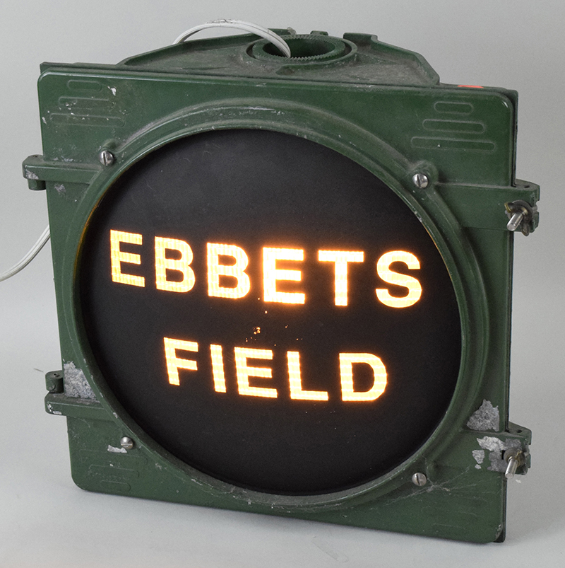 Description:"Ebbets Field" decorative light up street sign style display (EX) Metal enclosure has "Ebbets Field" text on front which can be lit from behind giving the appearance of street or trolley car sign. Enclosure is vintage however the front portion with text was added later for display purposes. Mild age and storage wear. Rewired and currently in working order: EX