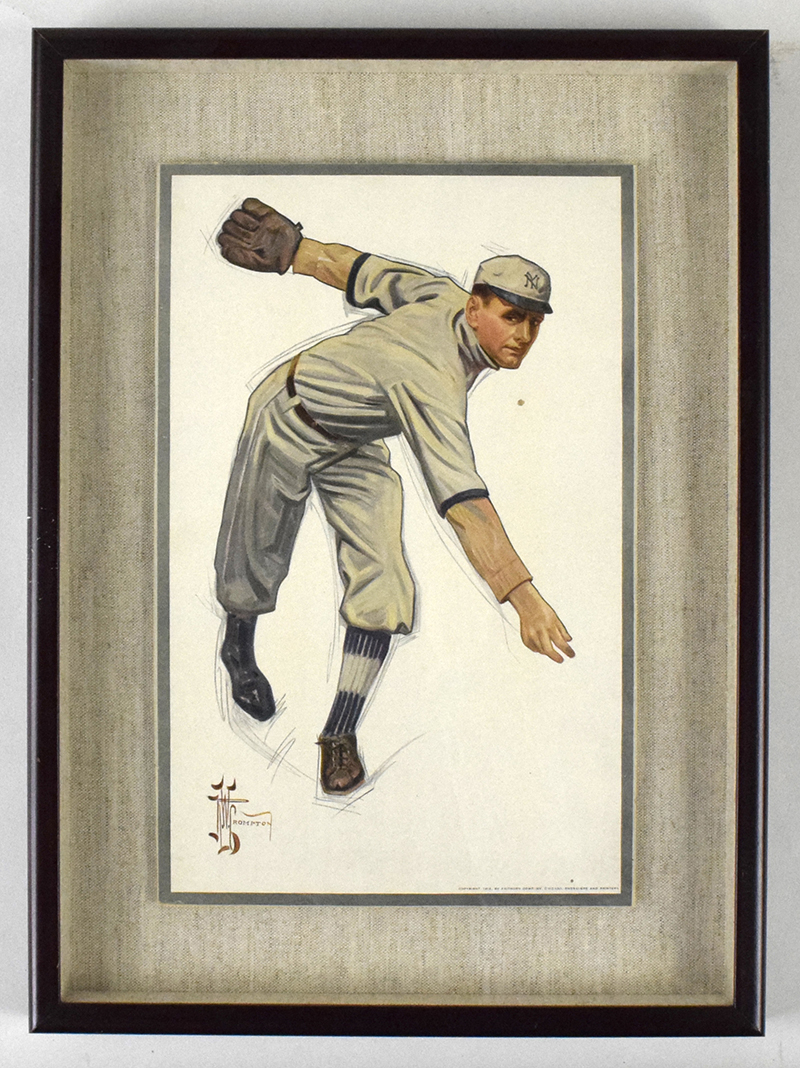 Description:1912 New York Yankees player illustration by Faithorn (EX) Charming period piece featuring a New York (likely Yankees) uniformed player in following through. Tastefully framed in a shadowbox style display measuring 14.5"x20" overall. Originally issued as part of a larger advertising piece and season schedule, the edges/borders have been trimmed off. There are some light creases/wrinkles and it is mounted by unknown method: EX