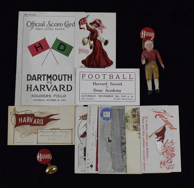 Description:c.1900s-20s Harvard football scorecard, postcards, and pins (11 pieces) Includes 1924 Harvard vs. Dartmouth game program (at Soldiers Field); (8) different c.1900s-10s Harvard football related/themed postcards including some notably tougher varieties; and (2) Harvard pins with football related ribbon/charm affixed (one a plastic player figure, the other a small metal football). Varying degrees of wear throughout with several postcards having been used: GD-EX