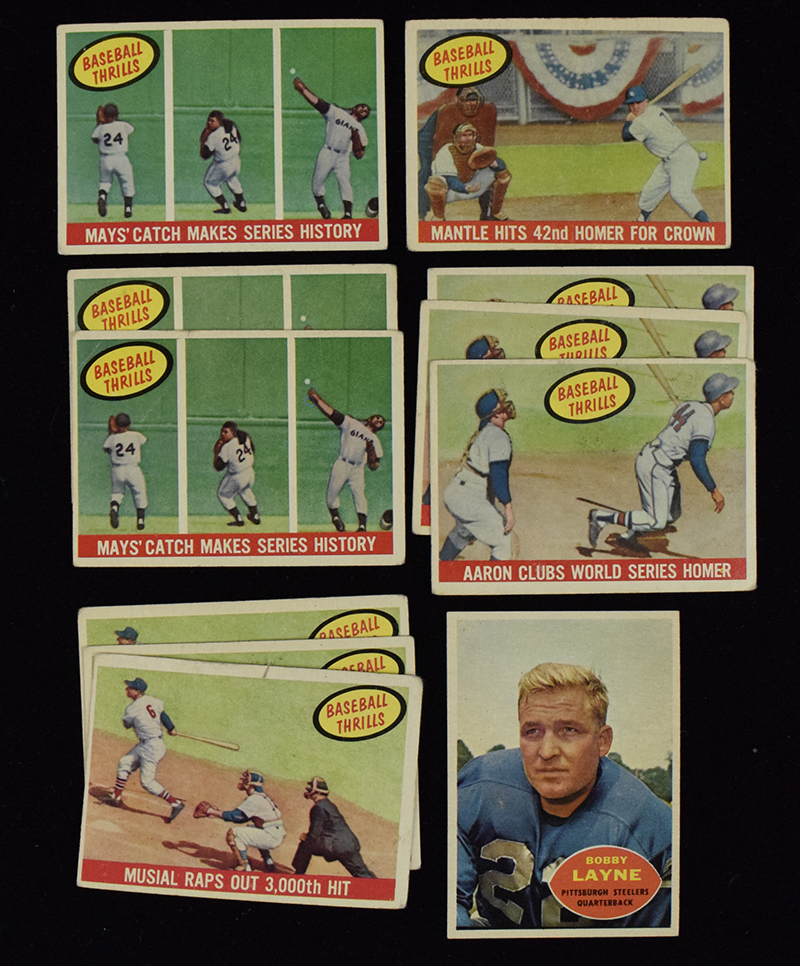 Description:Lot of approx. (224) 1960-1962 Topps and Fleer Baseball and Football cards (GD-EX) Includes (38) 1960 Topps Baseball cards incl. #461 Mantle (GD), (3) 464 Mays (GD to VG), (3) 467 Aaron (GD to VG), 468 Snider (GD), and 470 Musial (GD). There are some nicer condition cards in the remaining 1960 Topps; (96) 1960 Topps Football in nicer avg. EX condition with some better (there are about 10 cards which have a small ink stamp on back). There are at least (20) Hall of Famers within this group; (56) 1960 Fleer Greats in nicer avg. EX condition with some EX/MT and a few lesser; (31) 1961 Fleer Greats incl. Cobb and Gehrig in avg. VG condition; (3) 1962 Topps Baseball. Varying degrees of wear throughout: GD-EX
