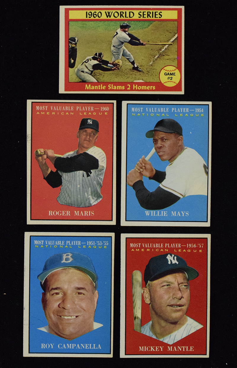 Description:1961 Topps Baseball lot of (28) cards in nice avg. EX condition (Avg. EX) Nice condition group in avg. EX condition with some better and only a few worse. Includes (12) Most Valuable Player cards incl. #471 Rizzuto (miscut), 475 Mantle (EX), 477 Fox (EX OC), 478 Maris (EX/MT OC print defect), 480 Campanella (EX OC print defect), and 482 Mays (EX wax on back); (12) 1960 World Series cards incl. #307 Mantle (EX/MT OC); and (4) "Leaders" cards: Avg. EX