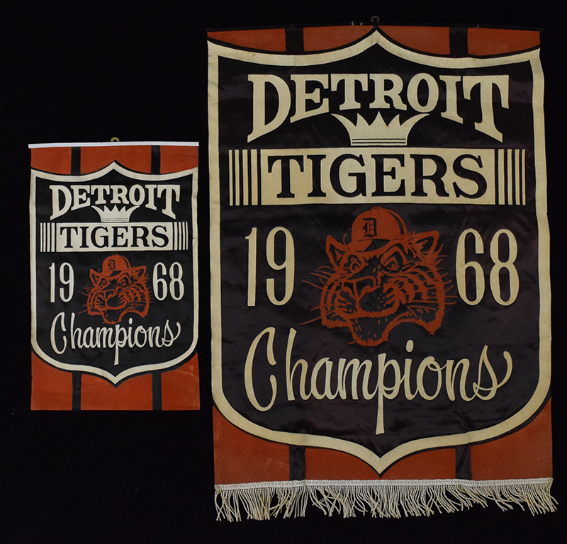 Description:Lot of (2) 1968 Detroit Tigers "Champions" banners (VG-EX) Includes smaller banner measuring just under 10"x16" and larger example measuring approx. 19.5"x28.5". There is some light general age and storage wear and the strip of metal at top of larger piece has some bends and breaks: VG-EX