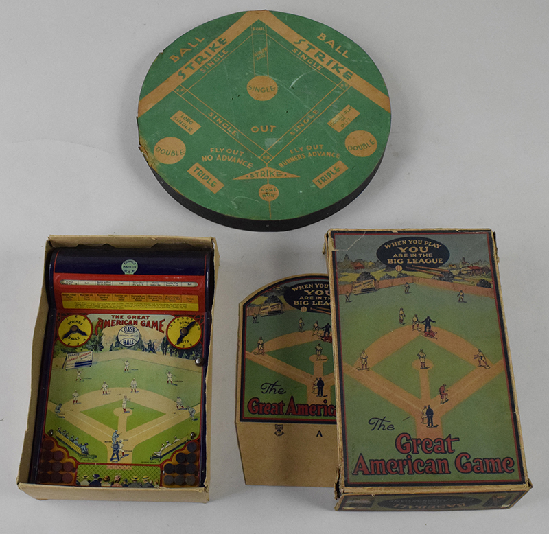 Description:1926 "Great American Baseball Game" tin toy in original box with baseball themed dart board: GD-EX Includes "Great American Baseball Game" table top tin game by Frantz with some light to mild discoloration and wear. Comes in original box which has more pronounced condition issues with some seams fixed/secured by tape from the inside. Also inside the box is a store display card meant to be positioned upright; later period but vintage dartboard with standard target on one side and a baseball game on the other. Includes (3) darts: GD-EX