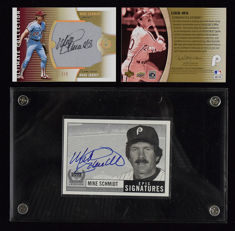 Description:Lot of (3) Mike Schmidt autographed insert cards (2 serial numbered) (NM) Includes 1999 Upper Deck Century Legends autographed Epic Signatures card; 2008 Upper Deck Ultimate Collection autographed jersey card (numbered "3/5") and autographed bat barrel card (numbered "02/15"). No mentionable wear: NM