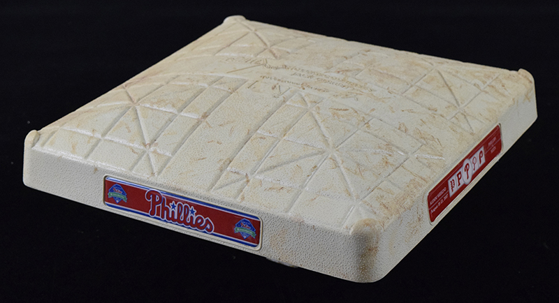 Description:August 11, 2017 Phillies vs. Mets game used base (Alumni Weekend) (MLB Auth) (EX) Regulation base by Schutt (with metal anchor) has Phillies team logo and "Alumni Weekend" medallions on the sides. MLB Authentication hologram (JC421648) confirms use in the game played in Philly and was on the field for innings (1-3) and Conforto and Cespedes homeruns: EX