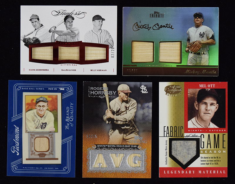 Description:Lot of (5) Hall of Famer 2001-2016 "game used" insert cards (Avg. NM) 2001 Leaf Certified Fabric of the Game Mel Ott jersey card ("17/42"); 2009 Topps T206 Mini Framed Piedmont bat card; 2009 Topps Sterling Rogers Hornsby bat card ("14/25"); 2011 Topps Tribute Mickey Mantle dual bat card ("55/75"); and 2016 Panini Flawless Hank Greenberg, Ralph Kiner, and Billy Herman bat card ("02/20"). Touch of very light scattered corner/edge to wear mentioned for accuracy: Avg. NM