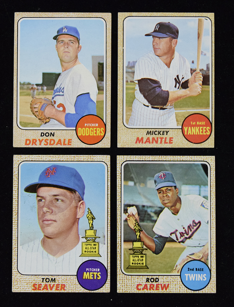 Lot of (6) 1968 Topps baseball Hall of Famers incl. Mantle (VG-EX/MT) Includes #20 Robinson (EX/MT-NM OC), 45 Seaver (VG, wax on front), 80 Carew (EX), 145 Drysdale (VG/EX), 280 Mantle (EX-EX/MT OC), and 490 Superstars (VG/EX): VG-EX/MT