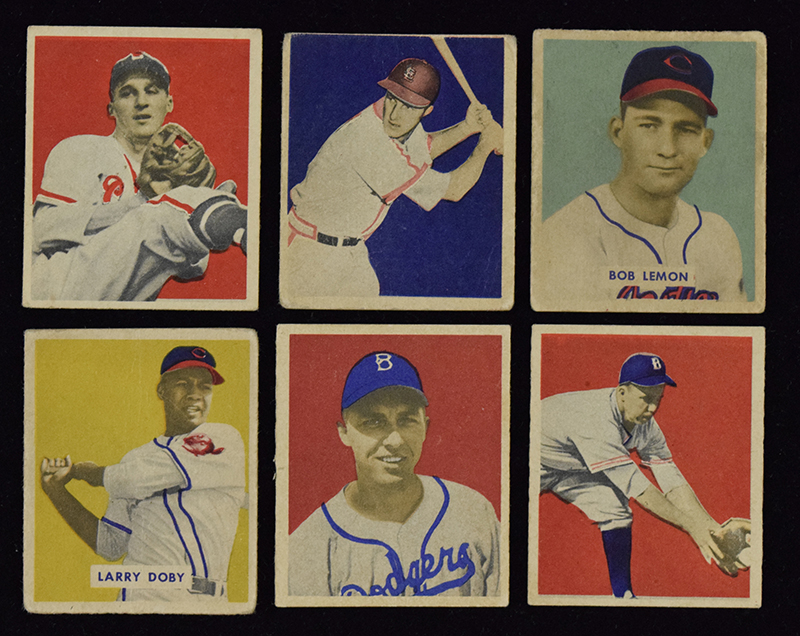 Description:Lot of (11) 1949 Bowman baseball Hall of Famer, Rookie, and star cards (GD-VG with a few lesser) Includes #24 Stan Musial (GD OC/miscut), 33 Spahn (GD), 36 Reese (pencil marks have been erased from back), 70 Furillo (VG), 85 Mize name on front (VG), 85 Mize no name on front (erased pencil on back), 98 Rizzuto (erased pencil on back), 100 Hodges (erased pencil on back), 110 Wynn (EX), 233 Doby (GD), and 238 Lemon (GD): GD-VG with a few lesser