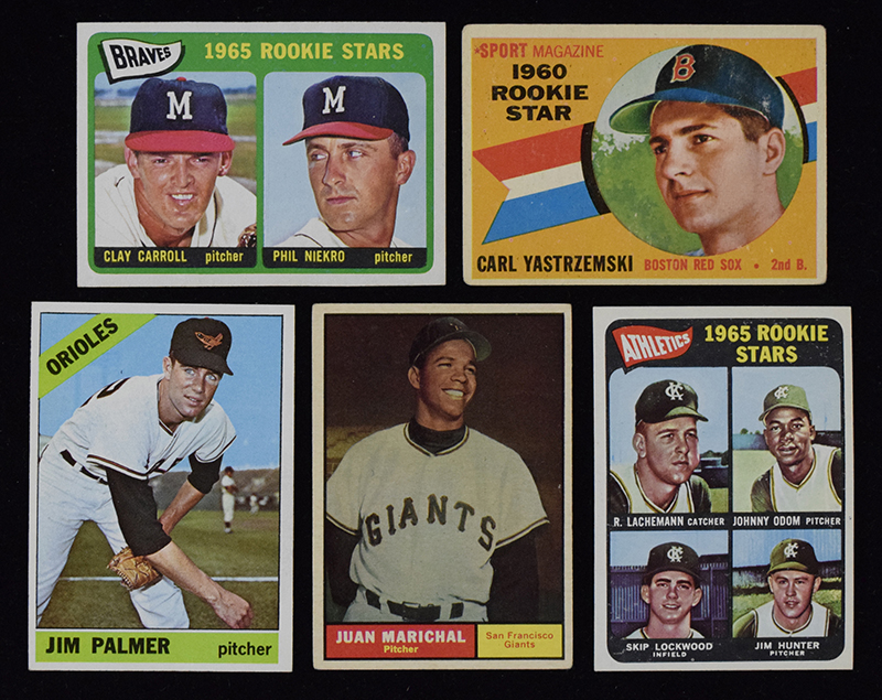 Lot of (6) 1960s Topps Hall of Famer Rookie cards (GD-EX/MT) Includes 1960 #148 Yastrzemski (GD), 1961 #417 Marichal (VG), 1965 #461 Niekro (EX-EX/MT), 1965 #477 Carlton (GD miscut), 1965 #526 Hunter (EX), and 1966 #126 Palmer (EX-EX/MT slightly OC): GD-EX/MT