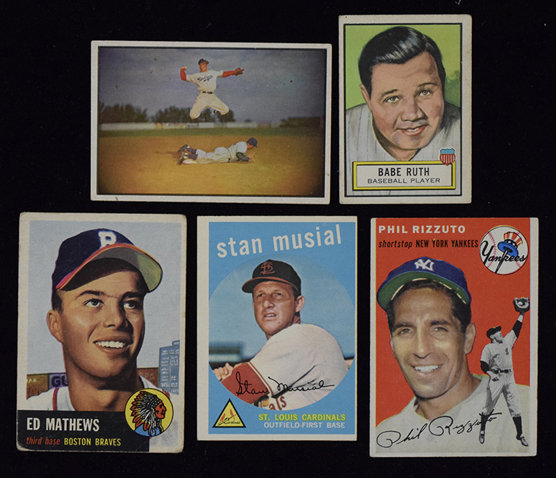 Lot of (11) 1950s Hall of Famer Topps, Bowman, and Look-N-See cards (GD-EX/MT) Includes 1951 Bowman #295 Lopez (VG); 1952 Topps Look-n-see #15 Ruth (VG OC); 1953 Bowman Color #33 Reese (VG); 1953 Topps #37 Mathews (GD); 1954 Bowman #1 Rizzuto (VG); 1954 Topps #17 Rizzuto (VG/EX) and #37 Ford (VG); 1959 Topps #150 Musial (EX/MT OC), 338 Anderson (EX/MT-NM OC), 439 Robinson (possibly trimmed), and 515 Killebrew (VG/EX); GD-EX/MT
