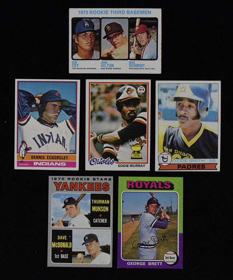 Description:Lot of (23) 1970s Topps baseball cards incl. Hall of Famers and Rookies (VG-NM) Includes 1970 Topps #189 Munson RC (EX OC) and 300 Seaver (EX/MT); 1971 Topps #14 Cencepcion (EX/MT-NM slightly OC), 465 McCarver (NM), 513 Ryan (GD), and 709 Baker (VG) (it is possible that one or two of the 71 cards have black colored added); 1973 #615 Schmidt (EX slightly OC); 1975 #61 Winfield (EX), 223 Yount (VG/EX OC), 228 Brett (EX-EX/MT), and 660 Aaron (EX/MT OC); 1976 #1 Aaron (EX/MT OC), 19 Brett (EX/MT-NM), 98 Eckersley (EX/MT-NM), (2) 316 Yount (EX/MT), and 480 Schmidt (NM OC); 1977 #580 Brett (NM OC); 1978 #36 Murray (EX/MT); 1979 #116 Smith (EX-EX/MT OC); and a handful of other cards: VG-NM