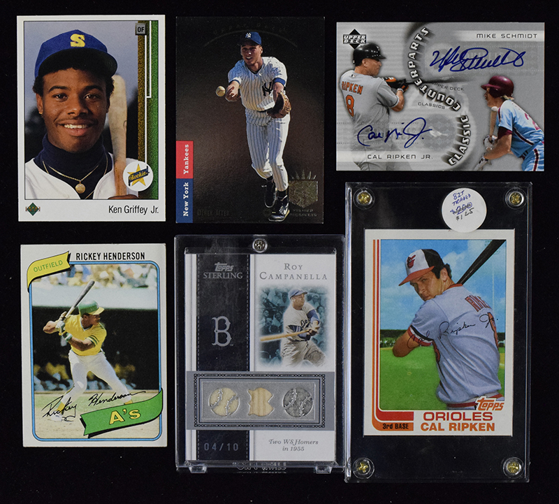 Description:Nice lot of modern baseball cards incl. Rookies, swatch/auto, and other insert cards (VG-NM) Includes 2005 Upper Deck Classic Counterparts Mike Schmidt and Cal Ripken Jr dual signed card; 2008 Topps Sterling Roy Campanella jersey/bat swatch card (numbered 4/10); (2) 1980 Topps #482 Henderson (VG/EX); 1982 Topps Traded #98T Ripken (EX/MT OC); 1982 Topps #21 Ripken (EX/MT); 1982 Fleer #176 Ripken (NM OC); 1983 Topps #83 Sandberg (EX/MT-NM OC); 1985 Donruss #438 Puckett (EX/MT-NM); 1989 Upper Deck #1 Griffey (EX/MT-NM); 1993 Upper Deck SP #279 Jeter (EX/MT-NM); 1994 Upper Deck SP #15 Alex Rodriguez (EX/MT); 2008 Upper Deck Goudey Sport Royalty Griffey Jr serial numbered "30/34); (11) Donruss Diamond Kings from several different years; Ripken Jr Sweet Spot jersey swatch card; Bob Gibson Topps Chrome signed insert; 1994 Leaf Limited Rookie Phenoms set of (10) cards; 1994 Leaf Limited Gold All Stars complete set of (18) cards; 1995 Leaf Limited Lumberjacks complete set of (16) cards; 1998 Topps Lords of The Diamond complete set of (15) cards; 1996 Leaf Picture Perfect complete set of (12) cards; 1996 Donruss Round Trippers complete set of (10) cards; 1996 Bowman's Best Preview near set (22 of 30 cards), Piazza is refractor and Griffey Jr is an atomic refractor; 1997 Bowman's Best Preview near set (17 of 20 cards); (13) Donruss Elite cards from several different years; and others: VG-NM