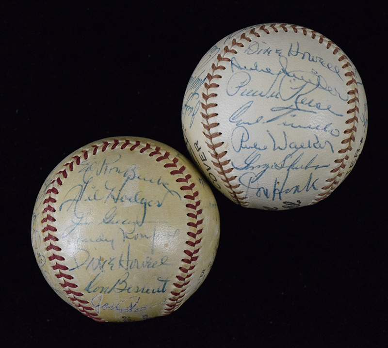Description:Clubhouse 1955 and 56 Brooklyn Dodger "team signed" baseballs (EX-NM) Pair of vintage display pieces with all non-authentic clubhouse signatures done in ink. Includes 1955 with (22) signatures and 1956 with (24) signatures. The 1955 is in superior condition as the 1956 has toned coat of shellac applied and some fading to signatures. There is an authentic Johnny Podres signature on the 1956 ball which was added later: EX-NM