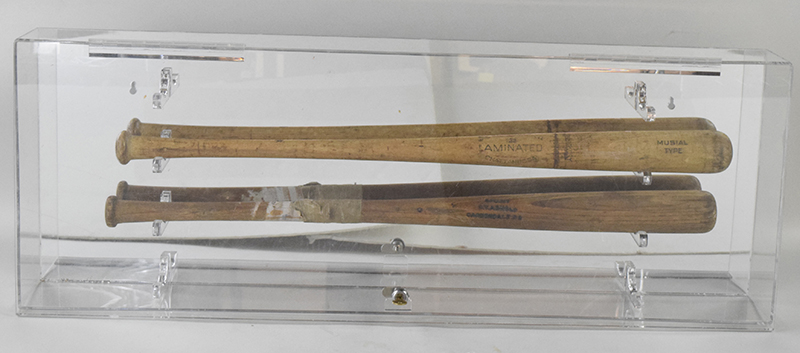 Description:High quality baseball bat display case, plus (2) vintage baseball bats (GD-NM). Includes 15"x42" Plexiglas display case with mirrored back and spaces for four bats (EX/MT-NM), includes key for the door); c.1930s 35" bat stamped "Mfg. By S.T. Arnold" "Carbondale, D.A." (GD); and c.1940s 35" Joe Engel Bat Co. 123 Stan Musial model bat (VG).