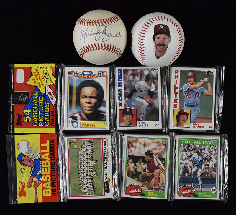 Description:Mike Schmidt memorabilia lot with full name signed baseball (EX-NM/MT). Includes B.Giamatti 1989 All-Star Game ball (light toning) signed by Michael Jack Schmidt in blue ink rating 8/9 out of 10 (JSA); 1978 Dynamite magazine with uncut 1978 Topps cards inside including Schmidt, Don Sutton, Joe Morgan, and others; 1981 Topps rack pack with Schmidt visible on top; 1984 Topps rack pack with Schmidt and Rod Carew visible on top. Remainder are mostly flats, and mainly promotional, commemorative, and souvenir items: EX-NM/MT