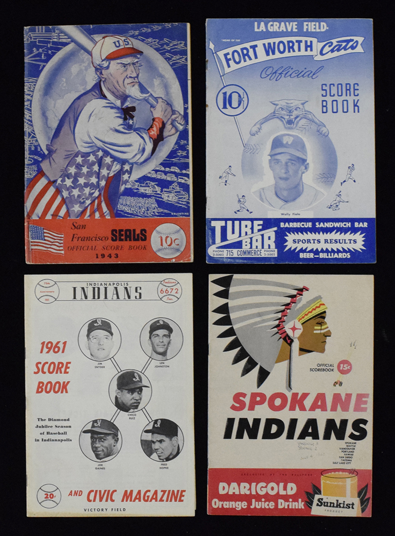 Description:Lot of vintage minor league baseball programs & publications from 1943-1973 (GD-NM). Programs include 1943 Portland Beavers at San Francisco Seals (GD unscored), 1948 Dallas Eagles at Fort Worth Cats (unscored), 1961 Houston Buffs at Indianapolis Indians (scored), 1962 Vancouver Mounties at Spokane Indians (scored), 1964 Rochester Red Wings at Richmond Virginians (lineups written but unscored), 1966 Indianapolis Indians at Oklahoma City 89ers (unscored), 1967 San Diego Padres at Oklahoma City 89ers (scored), and 1968 Amarillo Giants at El Paso Sun Kings (unscored). Also includes 1968 Pacific Coast League Record Book (name written on cover), and 1973 American Association media guide. Most appear to average VG/EX overall with normal age/handling wear. Range: GD-NM