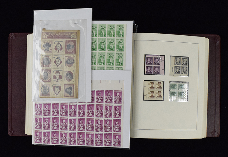 Description:Lot of over (1,200) stamps including $5 Alexander Hamilton plate block (NM-NM/MT overall). Includes a stamp album containing (1,141) vintage stamps with a mix of individuals and plate blocks including a 4-stamp plate block of $5 Alexander Hamilton stamps. Also includes a sheet of (40) 1981 Bobby Jones 18-cent stamps, a sheet of (40) 1981 Babe Zaharias 18-cent stamps, plus some collectible stamps. Various conditions throughout the lot, but most appear to remain NM-NM/MT overall.