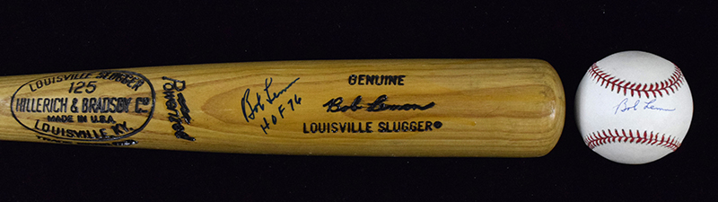 Description:Bob Lemon signed & inscribed replica model baseball bat, plus signed baseball (EX/MT-NM). Includes 35" Louisville Slugger O16 Bob Lemon replica model bat signed by Lemon in blue marker with "HOF 76" inscription (scuffing on opposite side of autograph), and G.Budig AL ball signed by Lemon in blue ink. Signatures rate 8/9 to 9 out of 10: EX/MT-NM