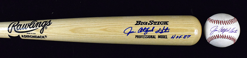 Description:Jim "Catfish" Hunter signed & inscribed baseball bat, plus signed baseball (EX-NM/MT). Includes 34" Rawlings-Adirondack Big Stick signed by Hunter in blue marker with "HOF 87" inscription, and B.Brown AL ball (toning) signed by Hunter in blue ink (Hunt Auctions hologram sticker). Signatures rate 8/9 to 9 out of 10: EX-NM/MT