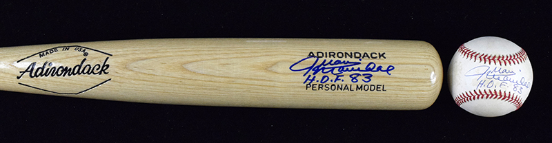 Description:Juan Marichal signed and inscribed baseball bat and baseball (EX-NM/MT). Includes 34" Adirondack signed by Marichal in blue marker with "HOF 83" inscription, and L.Coleman NL ball (toning) signed by Marichal in blue ink with "HOF 83" inscription. Signatures rate 8/9 to 9 out of 10: EX-NM/MT