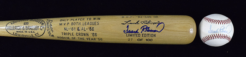 Description:Frank Robinson signed limited edition baseball bat & signed baseball (EX/MT-NM/MT). Includes 35" Louisville Slugger K55 Frank Robinson commemorative bat signed by Robinson in blue marker (#ed 27/100), and G.Budig AL ball (light toning) signed by Robinson in blue ink. Signatures rate 8/9 to 9 out of 10: EX/MT-NM/MT