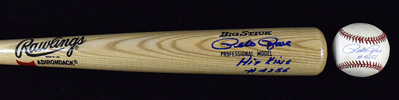 Description:Pete Rose signed and inscribed baseball bat and baseball (EX-NM/MT). Includes 34" Rawlings-Adirondack Big Stick signed by Rose in blue marker with "Hit King #4256" inscription, and W.White NL ball (toning) signed by Rose in blue ink with "#4256" inscription. Signatures rate 9 to 9/10 out of 10: EX-NM/MT