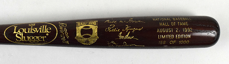 Description:Hal Newhouser, Tom Seaver, and Rollie Fingers multi-signed limited edition 1992 Baseball HOF Induction bat (EX/MT). 34" Louisville Slugger 1992 HOF Induction bat signed by Newhouser, Seaver, and Fingers in gold marker. Signatures rate 7/8 to 8/9 out of 10. Bat is #ed 158/1000. Very minor surface wear: EX/MT