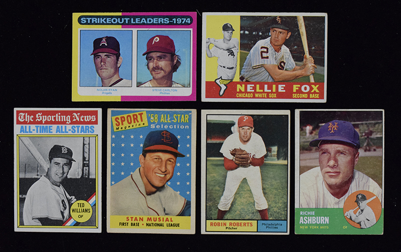 Description:Lot of (61) baseball cards from 1950-2001, plus five figurines (PR-NM/MT). Includes 1950 Bowman #131 Gromek; 1954 Bowman #s 41 Dark and 152 Vernon; 1955 Bowman #s 64, 139, and 287; 1956 Topps #s 106 and 161; 1958 Topps #s 476 Stan Musial (G/VG), and 494 Warren Spahn (writing on front); Ted Williams 1959 Fleer #s 34, 52, and 57 (trimmed); 1960 Topps #s 100 Nellie Fox, and 365 Minoso; 1961 Topps #s 20 Robin Roberts (VG/EX oc), 30 Fox (VG), 88 Richie Ashburn (VG), and 290 Musial (PR/FR); (2) 1963 Topps #135 Ashburn (G/VG-VG); 1966 Topps #110 Ernie Banks (FR/GD); 1967 Topps #45 Maris (GD). Remainder are from 1969-2001 and are a mix of stars, HOFers, and rookies. Also includes (3) Starting Lineups: Richie Ashburn, Ted Williams, and Nomar Garciaparra; (2) McFarlane figurines: Wilt Chamberlain and Curt Schilling: PR-NM/MT