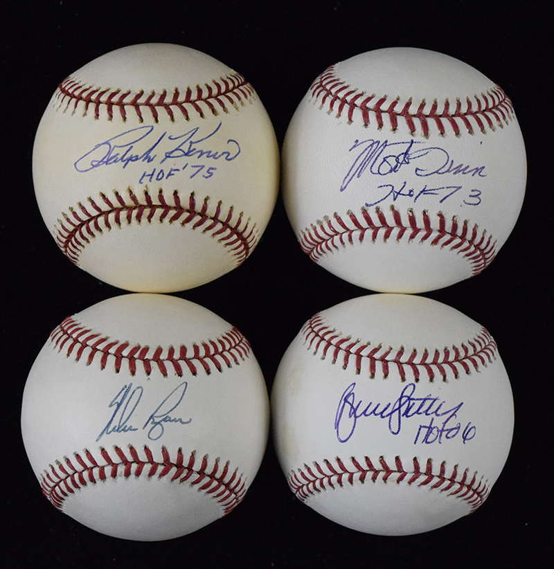 Description:Ralph Kiner, Monte Irvin, Nolan Ryan, Bruce Sutter signed baseballs (EX-NM). Includes L.Coleman NL ball (toning) signed by Ralph Kiner with "HOF 75" inscription, B.Selig ML ball signed by Monte Irvin with "HOF 73" inscription, W.White NL ball (light toning) signed by Nolan Ryan, and B.Selig ML ball (toning) signed by Bruce Sutter with "HOF 06" inscription. Signatures rate 8 to 9/10 out of 10: EX-NM