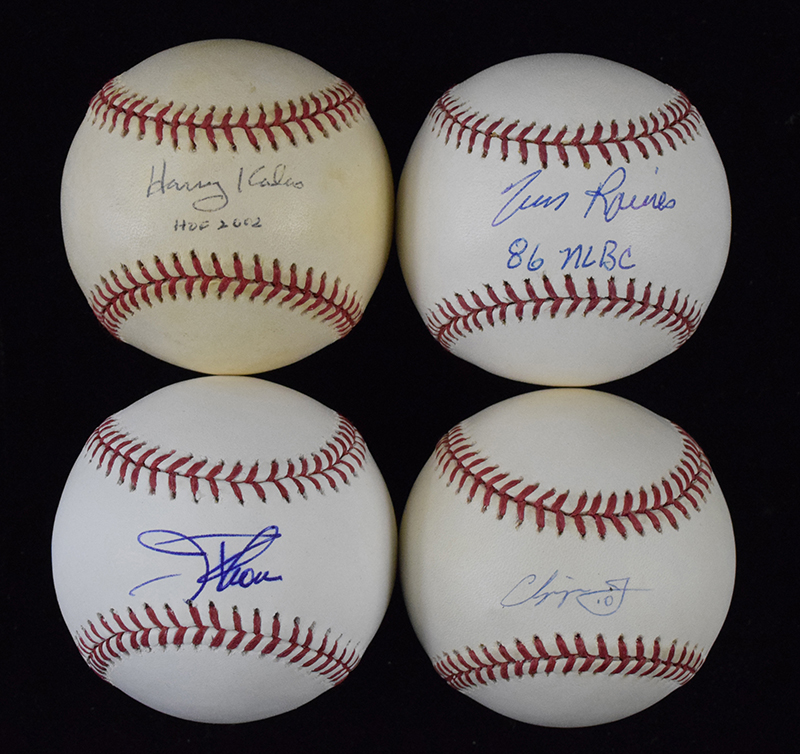 Description:Lot of (5) HOFers signed baseballs (EX-NM/MT). Includes L.Coleman NL ball (toning) signed by Harry Kalas with "HOF 2002" inscription, B.Selig ML ball signed by Tim Raines with "86 NL BC" inscription, B.Selig ML ball signed by Jim Thome, L.Coleman NL ball (light toning) signed by Chipper Jones, and B.Selig ML ball signed by Pat Gillick. Signatures rate 7 to 9 (avg 8) out of 10: EX-NM/MT