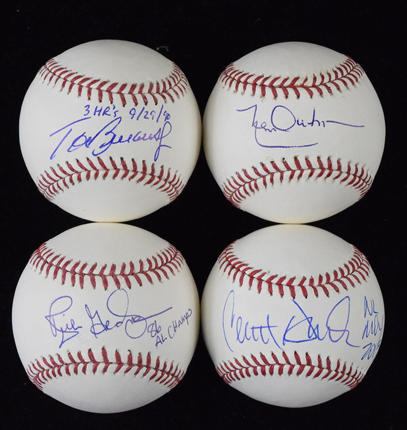 Description:Lot of (11) signed baseballs (EX-NM/MT). All are signed on B.Selig ML balls unless noted otherwise. Includes Dwight Gooden (toned C.Feeney NL ball), John Candelaria with "Aug 9, 76" no-hitter date inscription, Tom Herr, Tom Brunansky with "3 HR's 9/29/90" inscription, Leon Durham, Rich Gedman with "86 AL Champs" inscription, Clint Hurdle with "NL MOY 2013" inscription, Ken Oberkfell, Larry Parrish, Rick Rhoden, and Tim Teufel. Signatures rate 7 to 9/10 (avg 8) out of 10: EX-NM/MT