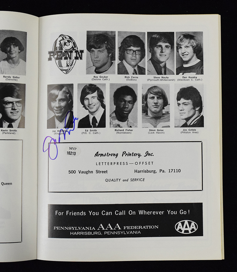 Description:Joe Montana signed 1974 Big 33 high school football program (NM). Montana signed inside at his photo in blue marker. Signature rates 9/10 out of 10. Just a hint of very minor age toning: NM