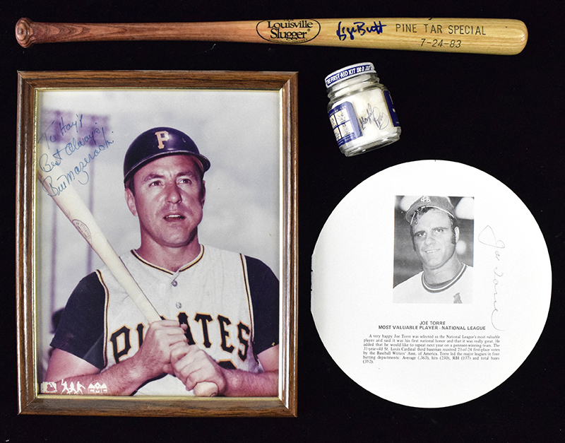 Description:Baseball HOFers autograph lot including Brett pine tar mini bat (EX-NM/MT). Includes 16" Louisville Slugger "Pine Tar Special" George Brett mini bat signed by Brett, vintage Vaseline jar signed by Gaylord Perry (empty), vintage publication page photo signed by Joe Torre, 12"x15" framed publication photo signed by Ryne Sandberg, and framed 8"x10" photo signed by Bill Mazeroski (personalized). Signatures rate 7/8 (Perry) to 9/10 out of 10: EX-NM/MT