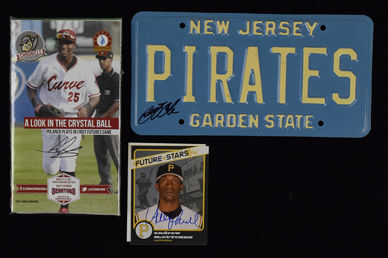 Description:Nice lot of current baseball player autographs (EX-NM/MT). Includes 4/27/2007 Binghamton Mets at Altoona Curve full ticket signed by Andrew McCutchen, (2) 4"x5" photos signed by Andrew McCutchen, Jameson Taillon and Gerrit Cole signed 2009 Upper Deck USA game used relic insert cards, 2012 Altoona Curve pocket schedule signed by Starling Marte, 2013 Topps Pro Debut #175 signed by Jose Berrios, 2013 Harrisburg Senators at Altoona Curve program signed by Gregory Polanco, 6/8/2014 Indianapolis Indians at Lehigh Valley IronPigs full ticket signed by Gregory Polanco, 2015 minor league lineup sheet signed by Francisco Lindor, and New Jersey "PIRATES" license plate signed by Gerrit Cole. Signatures rate 8 to 10 out of 10: EX-NM/MT